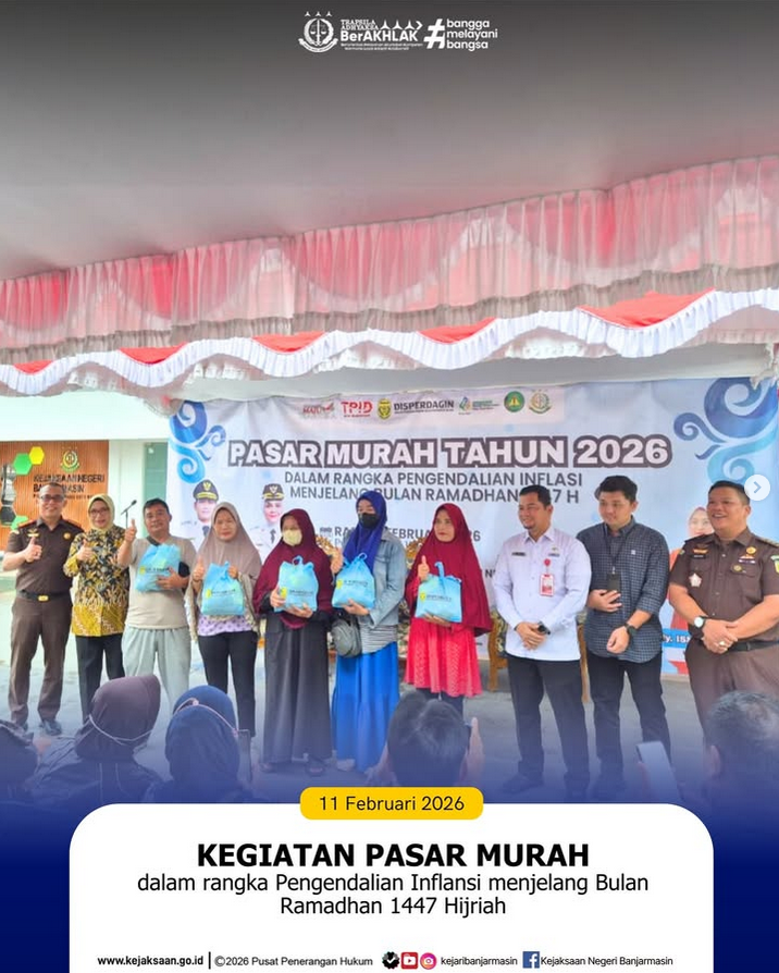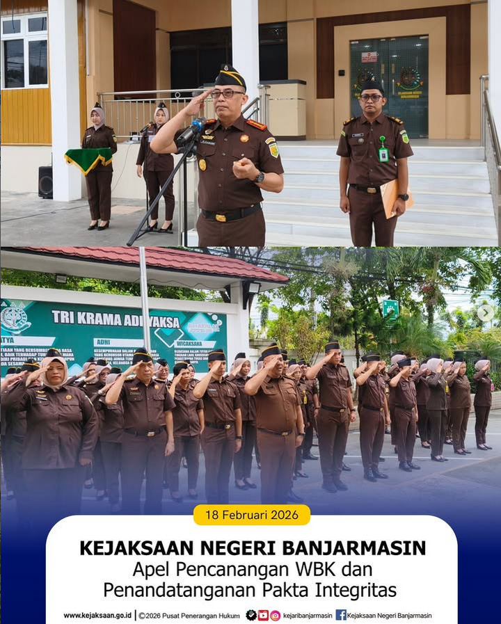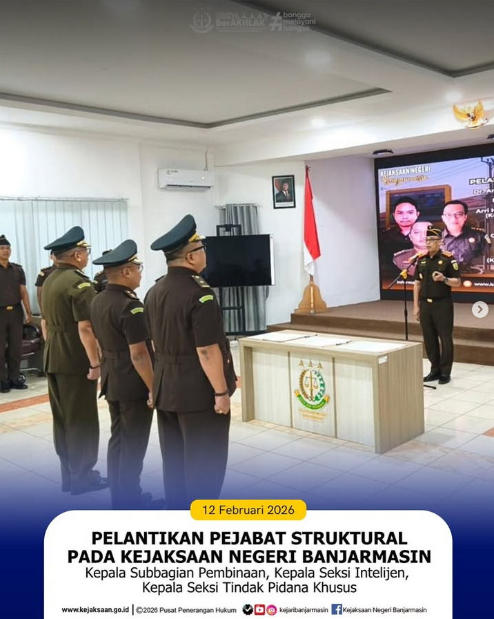 Pada Kamis, 12 Februari 2026, telah dilaksanakan pelantikan dan serah terima jabatan sejumlah pejabat struktural di lingkungan Kejaksaan Negeri Banjarmasin yang berlangsung di Banjarmasin. Kegiatan tersebut dipimpin langsung oleh Kepala Kejaksaan Negeri Banjarmasin, Eko Reandra Wiranto, serta dihadiri oleh jajaran pejabat dan pegawai di lingkungan kejaksaan setempat.