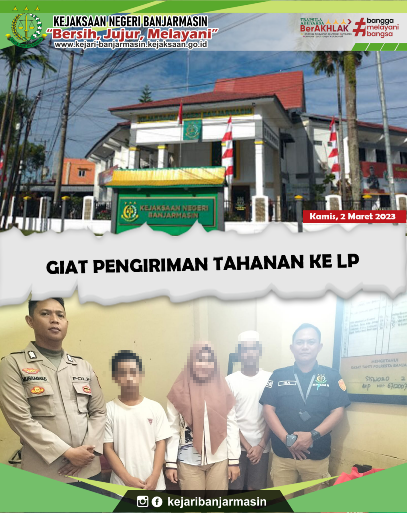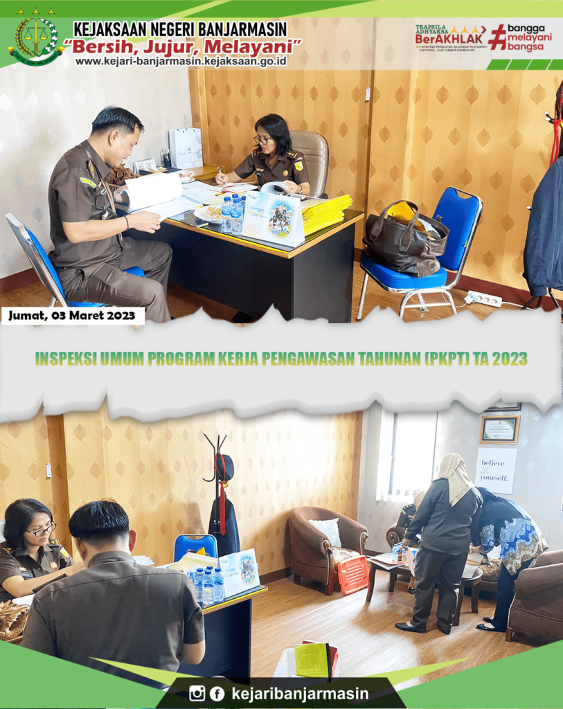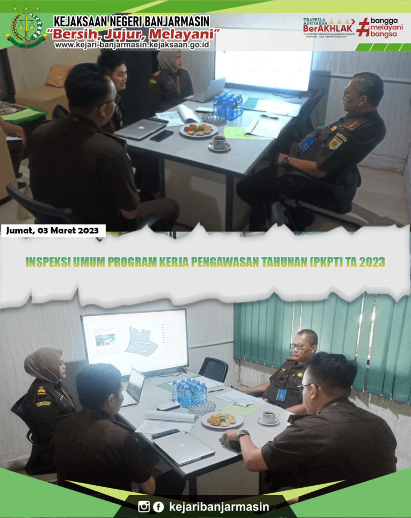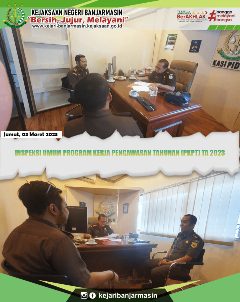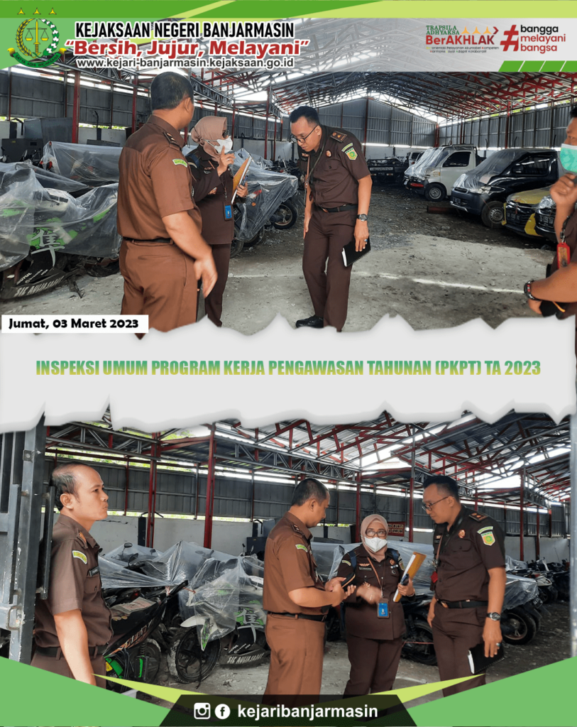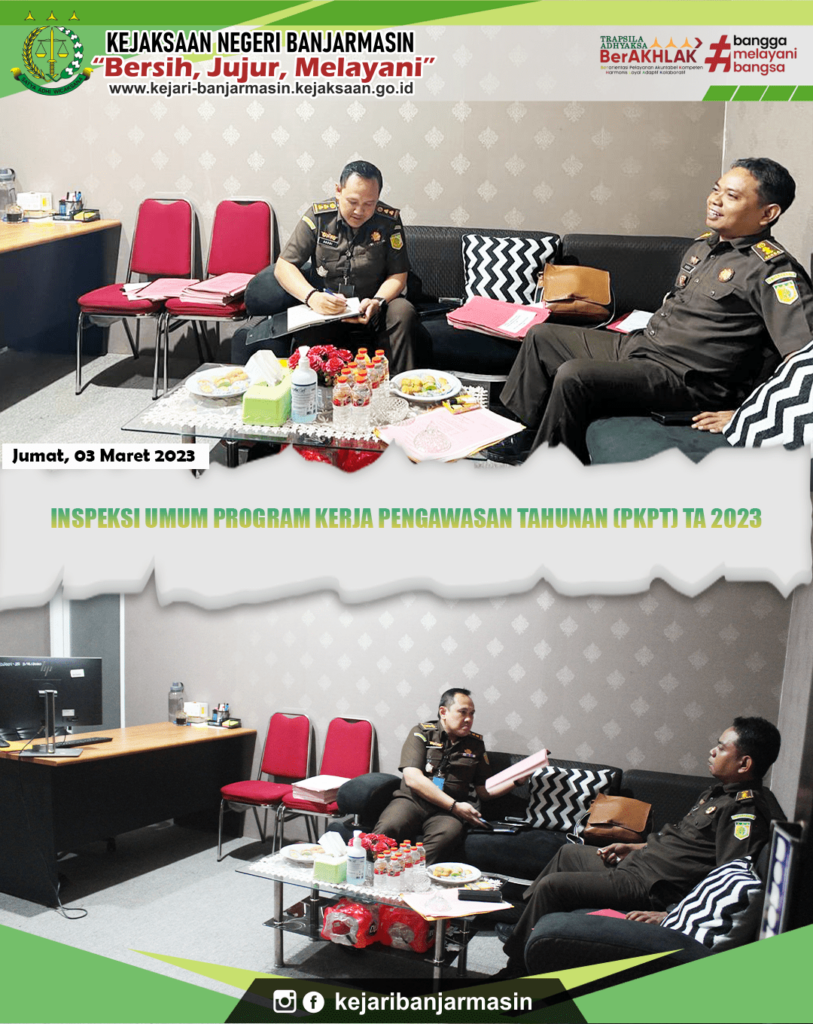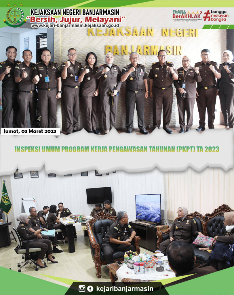 Jumat, 3 Maret 2023. Kepala Kejaksaan Negeri Banjarmasin Dr. Indah Laila beserta para jajaran menyambut kedatangan Inpektur IV Jaksa Agung Muda Pengawasan (JAM WAS) Dade Ruskandar S.H., M.H. beserta para jajaran TIM Inspeksi Umum Bidang Pengwasan Kejaksaan Agung Republik Indonesia. Inspeksi tersebut dalam rangka Inspeksi Umum Program Kerja Pengawasan Tahunan (PKPT) TA 2023 pada Kejaksaan Negeri Banjarmasin.