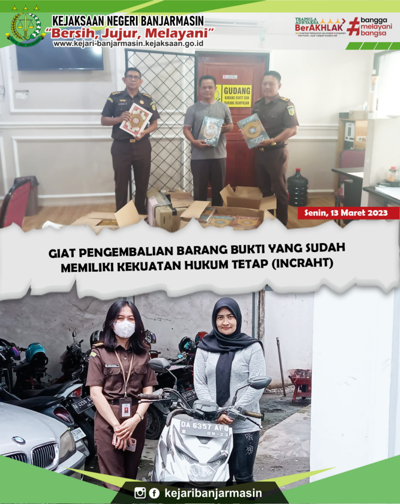 Senin, 13 Maret 2023. Giat Pengembalian Barang Bukti Yang Sudah Memiliki Kekuatan Hukum Tetap (Incraht).