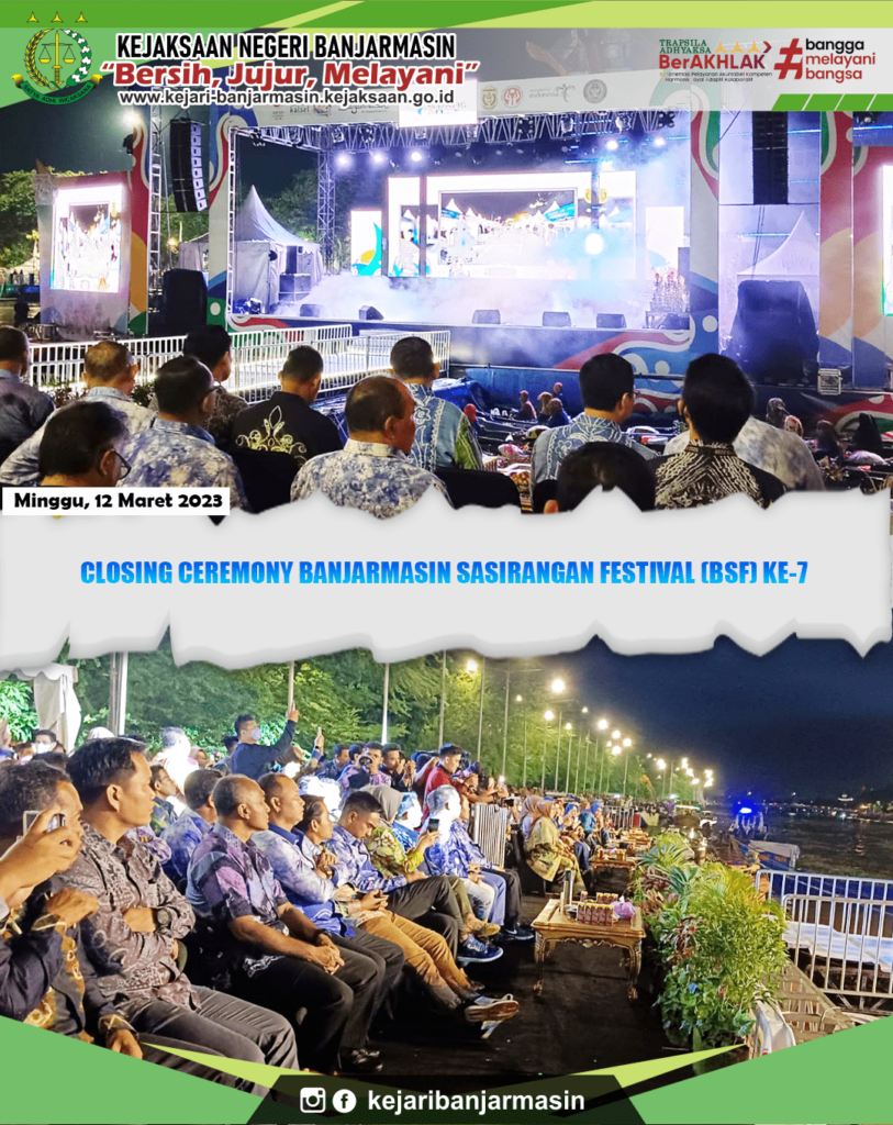 Minggu, 12 Maret 2023. Kepala Kejaksaan Negeri Banjarmasin Dr. Indah Laila Yang Dalam Hal Ini Diwakilkan Kepala Seksi Perdata & TUN Hendri Sipayung, S.H.,M.H Menghadiri Closing Ceremony Banjarmasin Sasirangan Festival (BSF) Ke-7 Bertempat di Panggung Utama Siring Menara Pandang Banjarmasin.