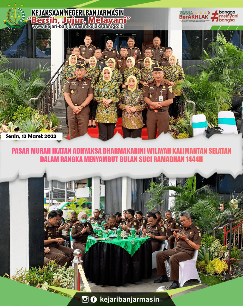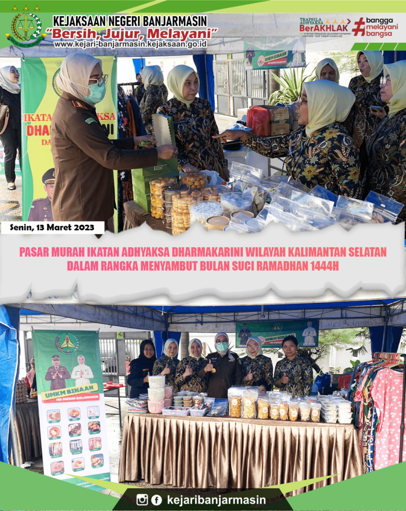 Senin, 13 Maret 2023. Kepala Kejaksaan Negeri Banjarmasin Dr. Indah Laila Menghadiri Pasar Murah Ikatan Adhyaksa Dharmakarini Wilayah Kalimantan Selatan Dalam Rangka Menyambut Bulan Suci Ramadhan 1444H Berlokasi Di Kantor Kejaksaan Tinggi Kalimantan Selatan.