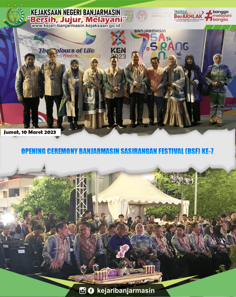 Jumat, 10 Maret 2023. Kepala Kejaksaan Negeri Banjarmasin Dr. Indah Laila Menghadiri Opening Ceremony Banjarmasin Sasirangan Festival (BSF) Ke-7 Bertempat di Panggung Utama Siring Menara Pandang Banjarmasin.