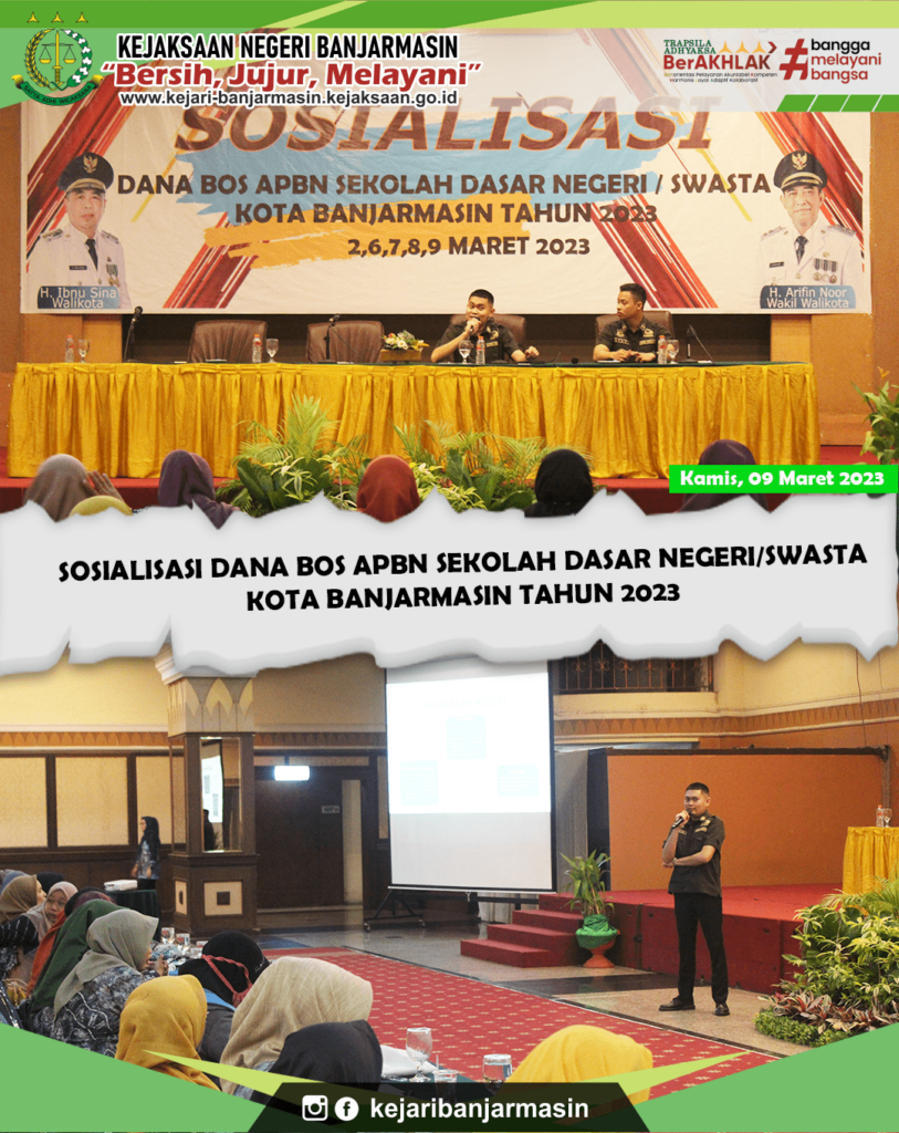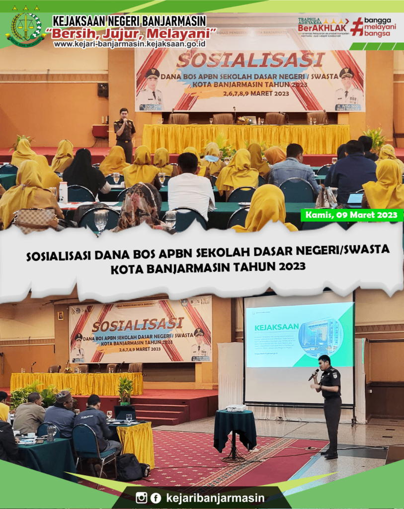 Pada tanggal 3, 6, 7, 8 dan 9 Maret 2023, Kepala Subseksi Ekonomi, Keuangan, dan PPS Bidang Intelijen Rizky Senja Raifiesha, S.H Menjadi Narasumber Dalam Acara Sosialisasi Dana BOSP APBN SD Negeri dan Swasta Se Kota Banjarmasin Yang Berokasi Di Hotel Banjarmasin International.