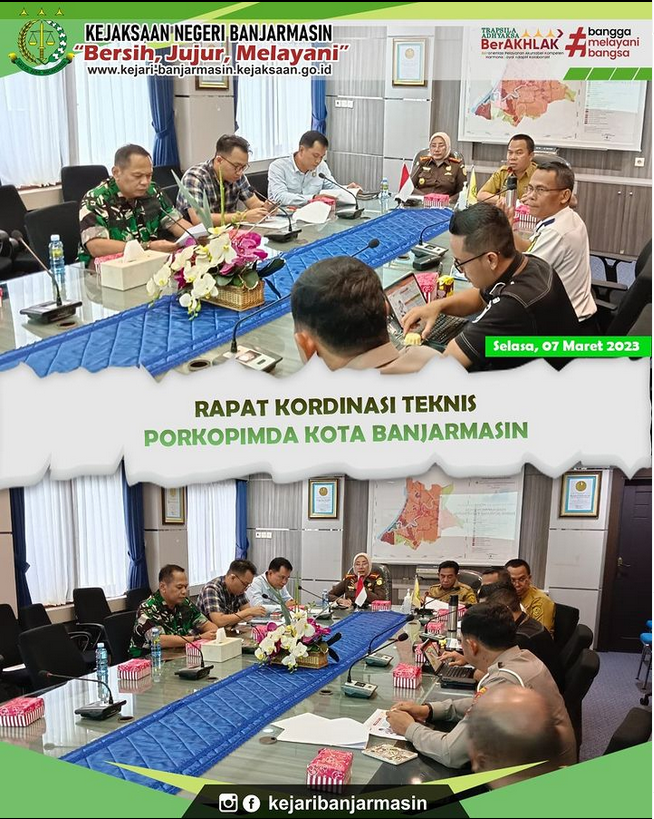 KEPALA KEJAKSAAN Rapat Kordinasi Teknis Forkopimda Mar 13, 2023 admin 0 Comment Selasa, 7 Maret 2023. Rapat Kordinasi Teknis Forkopimda Kota Banjarmasin Bertempat Di Pemkot Banjarmasin.