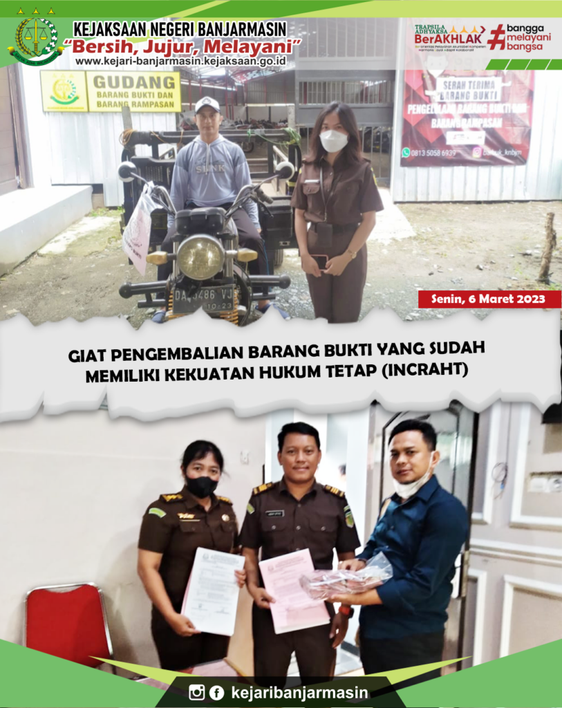 Senin, 6 Maret 2023. Giat Pengembalian Barang Bukti Yang Sudah Memiliki Kekuatan Hukum Tetap (Incraht).