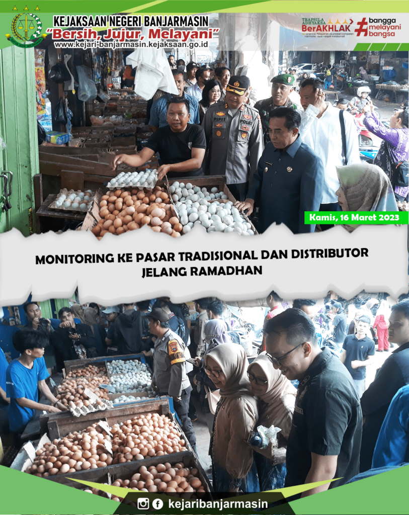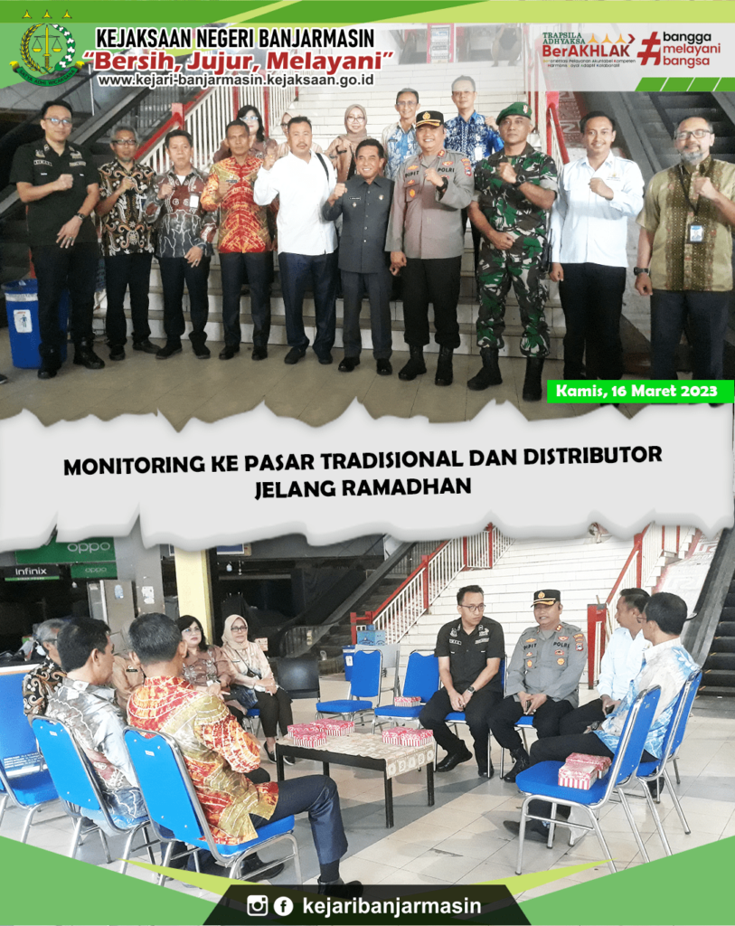 Kamis, 16 Maret 2023. Kepala Kejaksaan Negeri Banjarmasin Dr. Indah Laila Yang Dalam Hal Ini Diwakilkan Kepala Seksi Intelijen Dimas Purnama Putra, S.H.,M.H Menghadiri Giat Monitoring Ke Pasar Tradisional Dan Distributor Jelang Ramadhan.