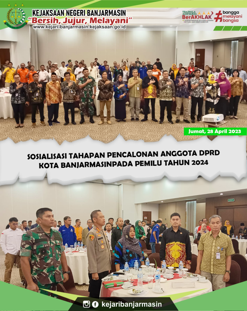 Kepala Kejaksaan Negeri Banjarmasin yang diwakili oleh Kepala Sub Seksi Ekonomi, Keuangan, dan PPS Rizky Senja Raifiesha, SH., menghadiri Sosialisasi ( Tahapan Pencalonan Anggota DPRD Banjarmasin Pada Pemilu Tahun 2024 ), bertempat di Hotel Rattan Inn Banjarmasin Ruang Calamus 2.