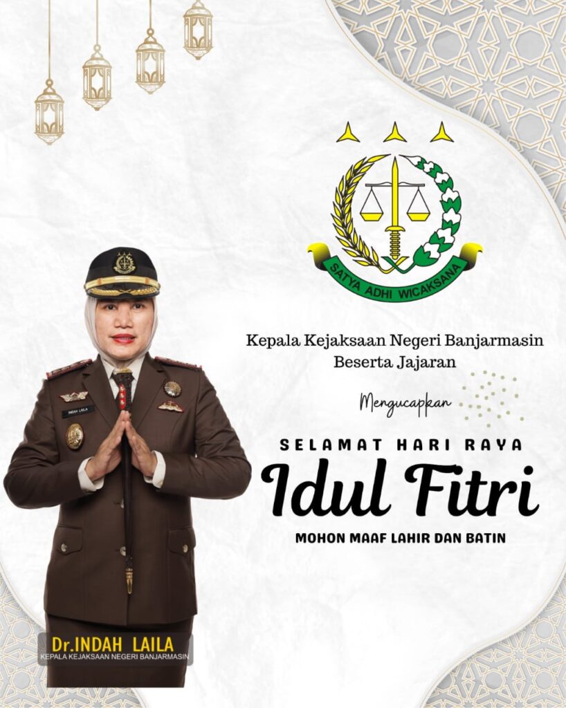 Kepala Kejaksaan Negeri Banjarmasin Dr Indah Laila Beserta Seluruh Pegawai Mengucapkan ‘Minal Aidin Wal Faizin’ Selamat Hari Raya Idul Fitri 1444 H.
