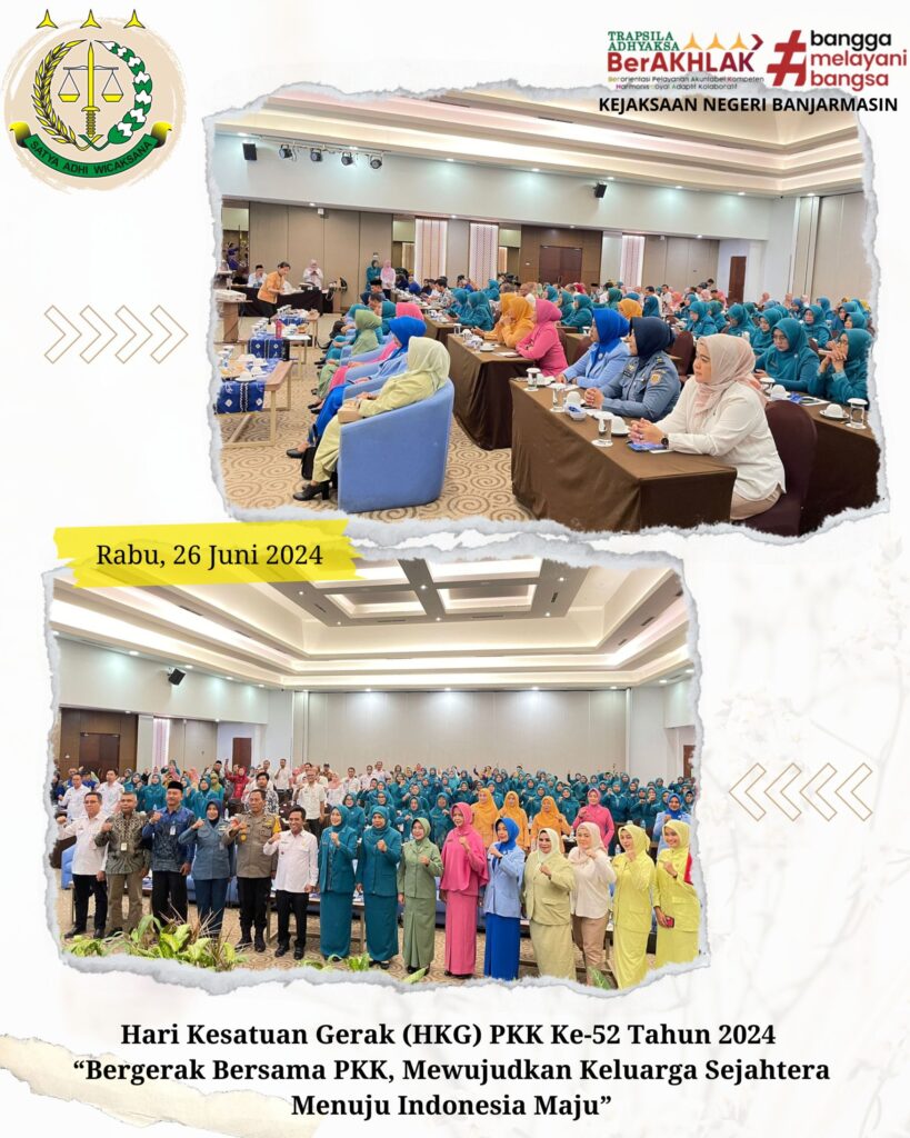 Bahwa pada hari Rabu 26 Juni 2024, Kepala Kejaksaan Negeri Banjarmasin yang diwakili oleh Ibu Indah Lestari, S.H.,M.H Menghadiri Hari Kesatuan Gerak (HKG) PKK Ke-52 Tahun 2024 “Bergerak Bersama PKK, Mewujudkan Keluarga Sejahtera Menuju Indonesia Maju” bertempat di Rattan Inn Banjarmasin.