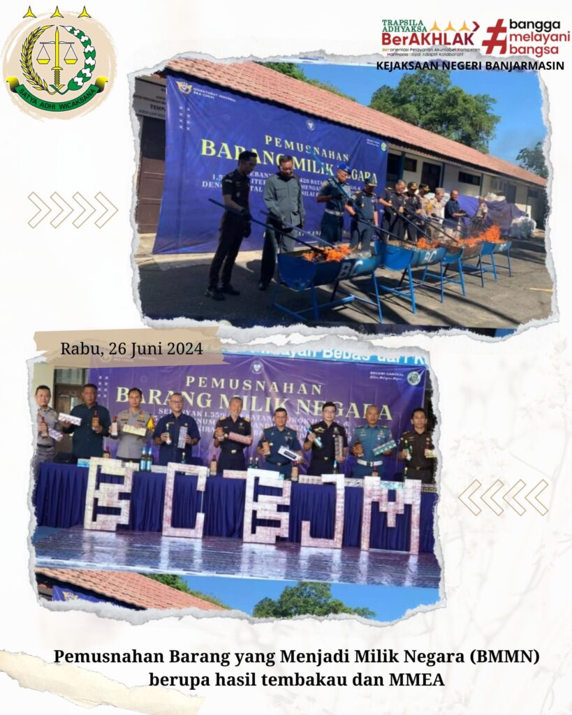 Bahwa pada hari Rabu 26 Juni 2024., Kepala Kejaksaan Negeri Banjarmasin yang diwakili oleh Kepala Sub Seksi Tut,Uheksi Bidang Tindak Pidana Khusus Ricky Sar Maruli Tua Purba, S.H Menghadiri Pemusnahan Barang yang Menjadi Milik Negara (BMMN) berupa hasil tembakau dan MMEA bertempat di KPPBC TMP B Banjarmasin