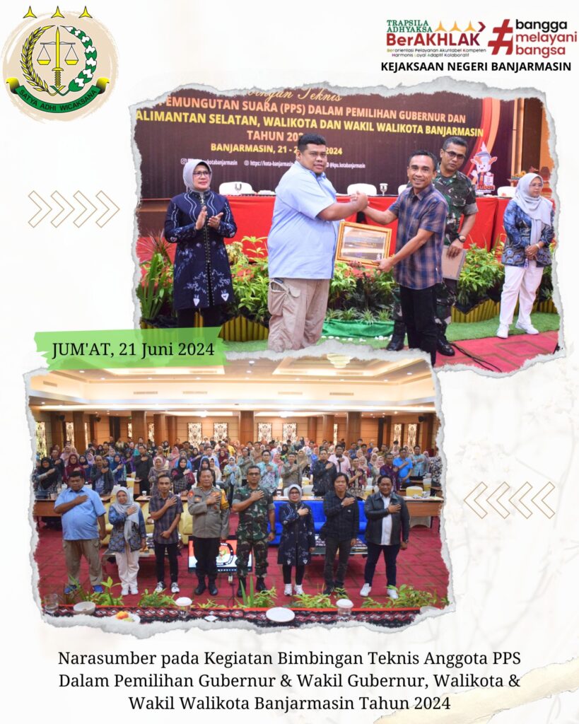 Bahwa pada hari Jum’at 21 Juni 2024, Kepala Kejaksaan Negeri Banjarmasin yang diwakili oleh Jaksa Fungsional Bapak I Wayan Sutije, SH.,MH. Menjadi Narasumber Pada Kegiatan Bimbingan Teknis Anggota PPS Dalam Pemilihan Gubernur dan Wakil Gubernur, Walikota dan Wakil Walikota Banjarmasin Tahun 2024 Bertempat di Aula Kayuh Baimbai Best World Kindai Hotel Banjarmasin.