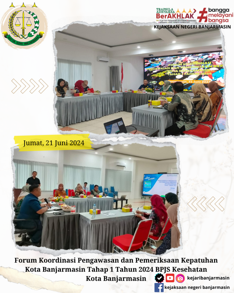 Pada hari Jumat tanggal 21 Juni 2024 bertempat di aula R. Soeprapto kantor Kejaksaan Negeri Banjarmasin telah dilaksanakan Rapat Forum Koordinasi Pengawasan dan Pemeriksaan Kepatuhan Kota Banjarmasin Tahap 1 Tahun 2024 yang diselenggarakan oleh Badan Penyelenggara Jaminan Sosial (BPJS) Kesehatan Cabang Banjarmasin.
