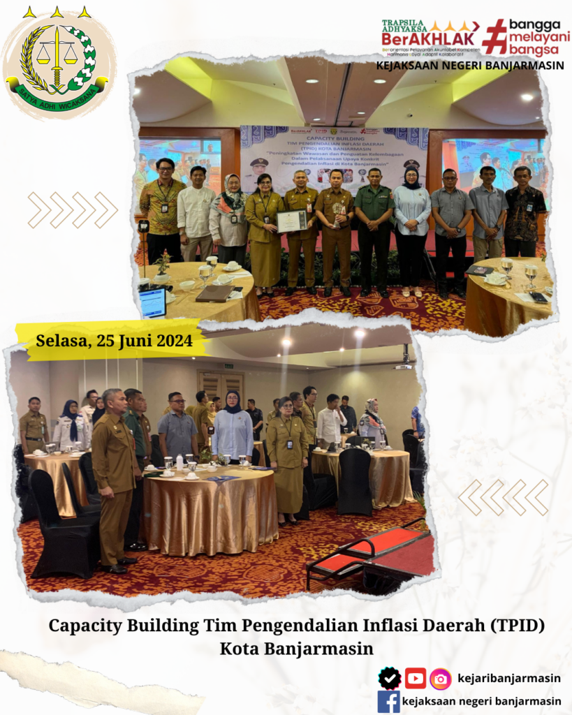 Selasa 25 Juni 2024. Kepala Kejaksaan Negeri Banjarmasin yang diwakili oleh Kepala Sub Seksi Perdata dan Tata Usaha Negara Ibu Grhady Dwi Hartanti,SH. Menghadiri Capacity Building Tim Pengendalian Inflasi Daerah (TPID) Kota Banjarmasin “Peningkatan Wawasan dan Penguatan Kelembagaan Dalam Pelaksanaan Upaya Konkrit Pengendalian Inflasi di Kota Banjarmasin” bertempat di Venus Meeting Room Galaxy Hotel Banjarmasin.