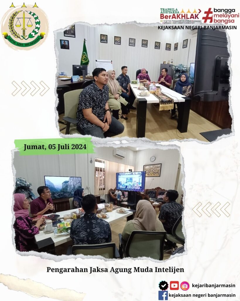 Jum’at 05 Juli 2024 Kepala Kejaksaan Negeri Banjarmasin Dr.Indah Laila, beserta Kepala Seksi Intelijen Dimas Purnama Putra,S.H,.M.H dan Staff Intelijen mengikuti kegiatan pengarahan Jaksa Agung Muda Intelijen melalui Zoom Meeting.