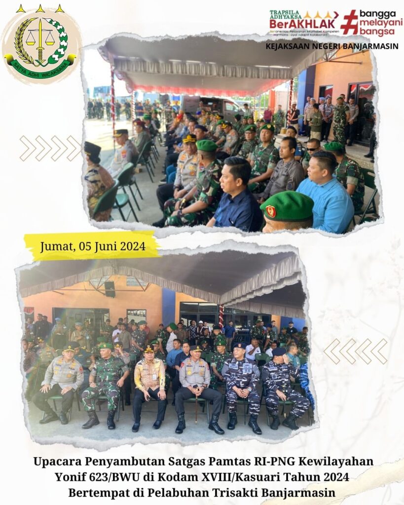 Jum’at 5 Juli 2024, Kepala Kejaksaan Negeri Banjarmasin yang diwakilkan Dr. Amir Giri Muryawan, S.H.,M.H Kasi Perdata dan Tata Usaha Negara Kejaksaan Negeri Banjarmasin. Menghadiri Upacara Penyambutan Satgas Pamtas RI-PNG Kewilayahan Yonif 623/BWU di Kodam XVIII/Kasuari Tahun 2024 Bertempat di Pelabuhan Trisakti Banjarmasin.