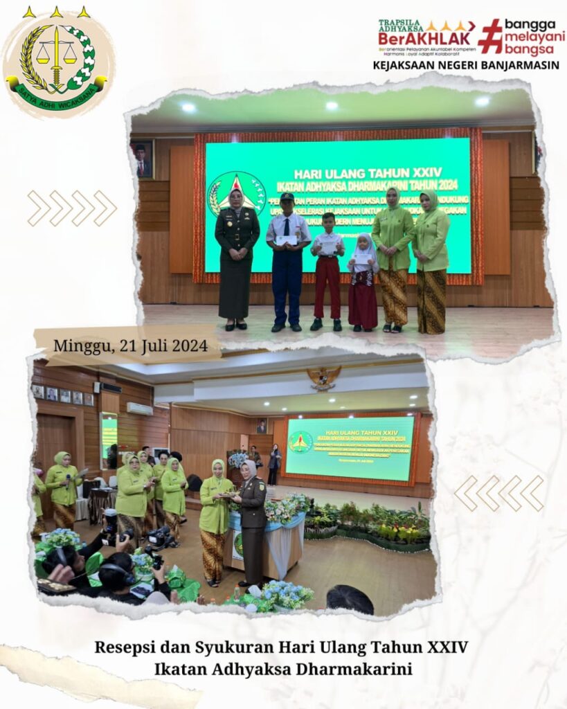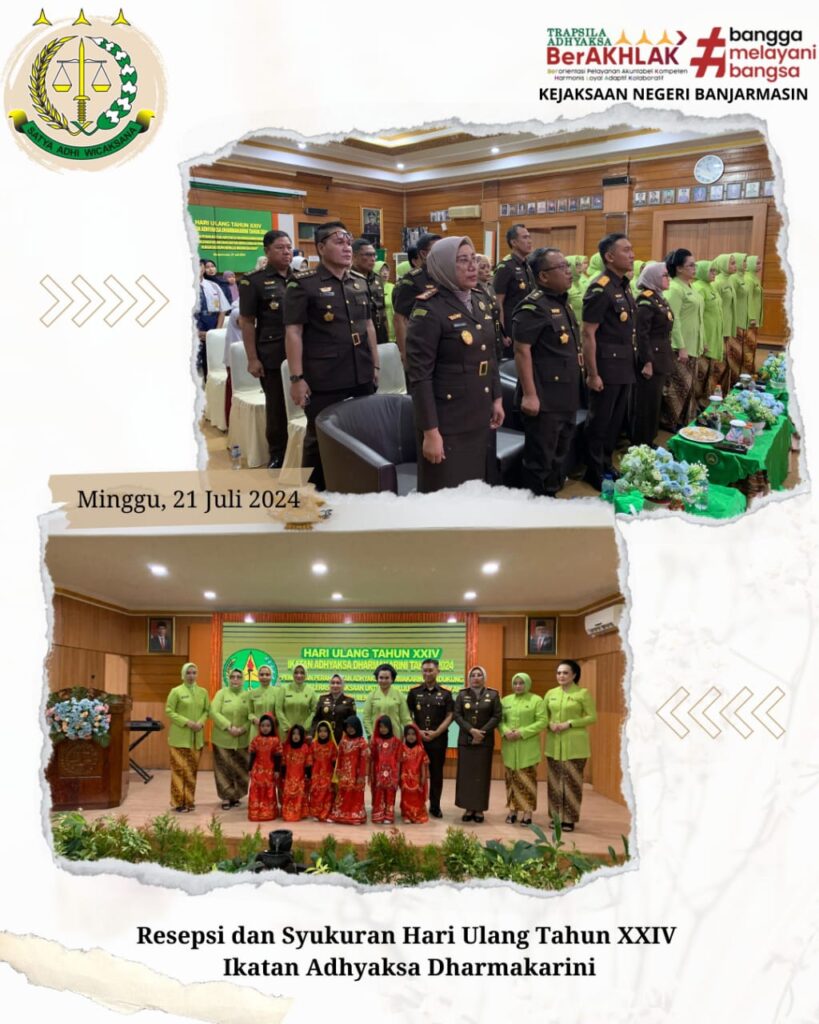 Bahwa Pada Hari Minggu 21 Juli 2024 Kepala Kejaksaan Negeri Banjarmasin Dr Indah Laila Beserta Seluruh Anggota Ikatan Adhyaksa Dharmakarini Daerah Banjarmasin Melaksanakan Resepsi Dan Syukuran Hari Ulang Tahun Ke-24 Bertempat Di Aula Kantor Kejaksaan Tinggi Kalimantan Selatan.