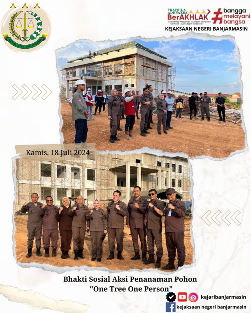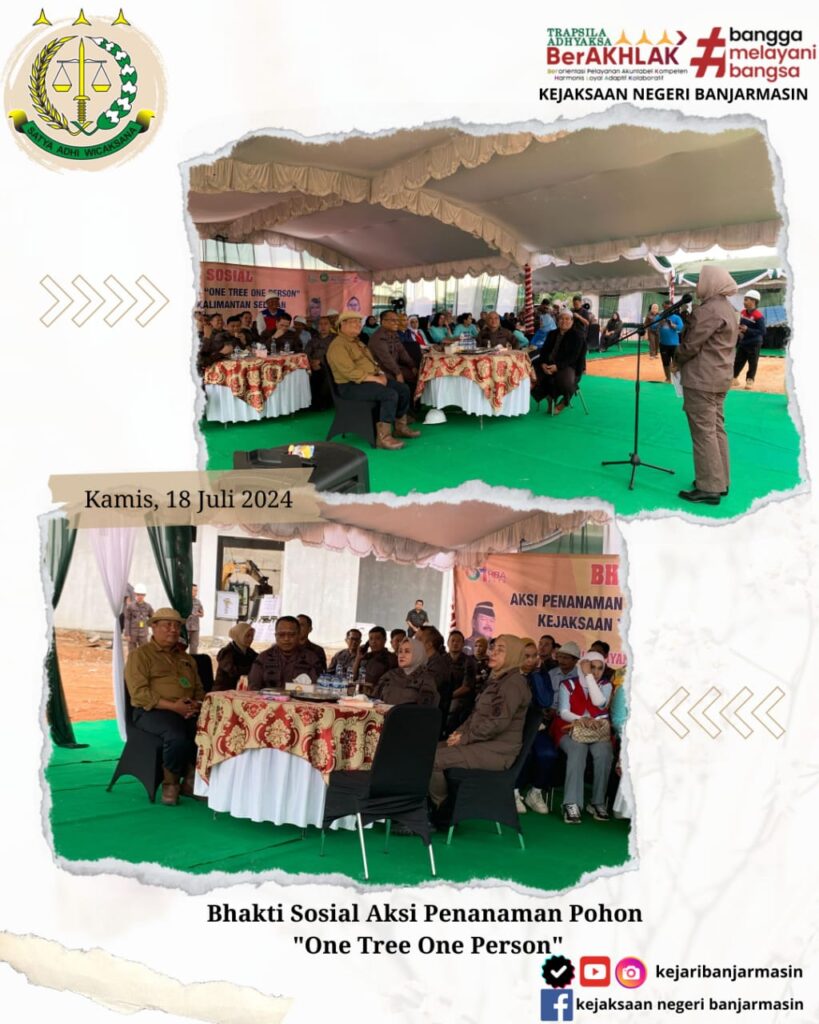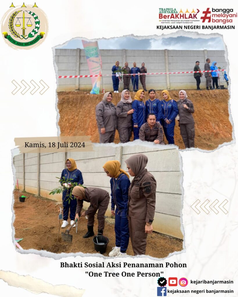 Bahwa Pada Hari Kamis, 18 Juli 2024 Kepala Kejaksaan Negeri Banjarmasin Dr. Indah Laila Mengikuti Bhakti Sosial Aksi Penanaman Pohon “One Tree One Person”. Kegiatan tersebut dilakukan di Halaman Kantor Baru Kejaksaan Tinggi Kalimantan Yang berada Di Banjar Baru.