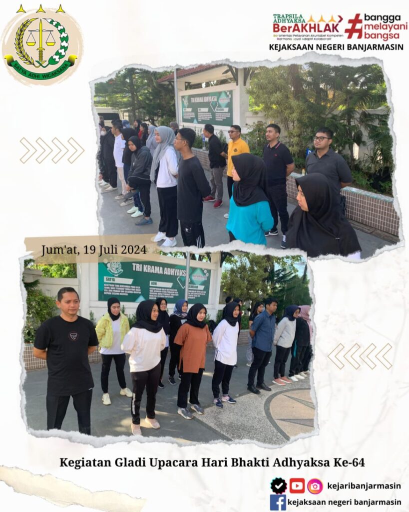 Bahwa Pada 19 Juli 2024 Pegawai Kejaksan Negeri Banjarmasin Mengikuti Acara Gladi Upacara Hari Bhakti Adhyaksa Ke – 64 Yang dilakukan di Halaman Kantor Kejaksaan Tinggi Kalimantan Selatan.