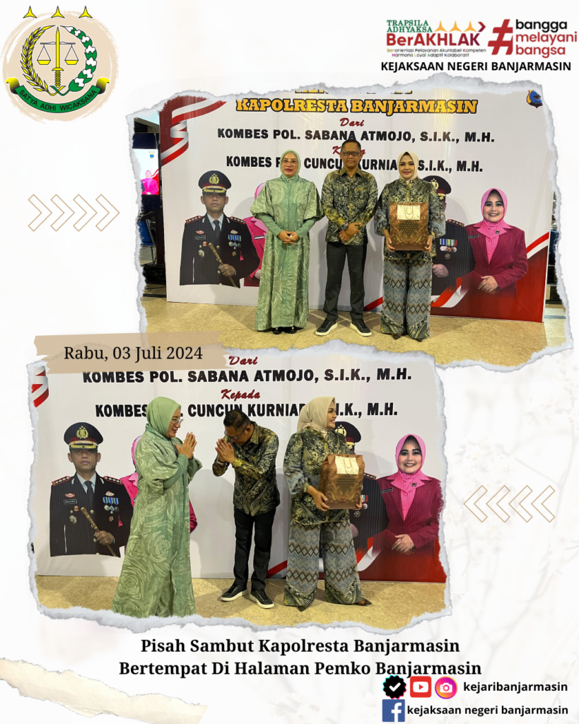 Rabu, 3 Juli 2024. Kepala Kejaksaan Negeri Banjarmasin Dr. Indah Laila Menghadiri Acara Pisah Sambut Yang dilakukan Bersama Forkopimda dan Walikota Banjarmasin Bertempat di Halaman Kantor Pemko Banjarmasin.
