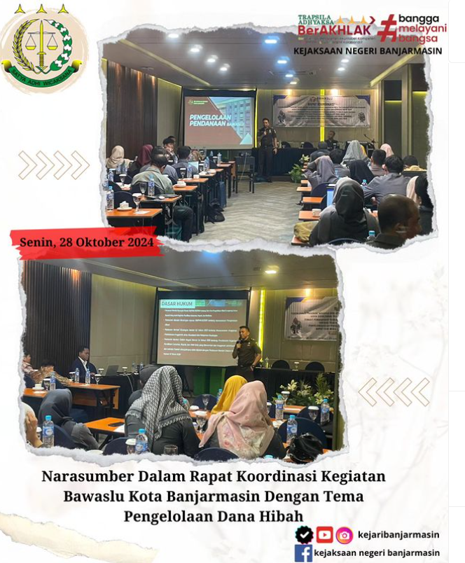 Kepala Kejaksaan Negeri Banjarmasin yang di wakilkan oleh Kepala Sub Seksi Tindak Pidana umum Masden Kahfi SH. Menghadiri rapat koordinasi perencanaan program, kegiatan dan anggaran dengan pemerintah Kota dan Bawaslu Kota Banjarmasin serta Sekretariat panwascam sekota Banjarmasin dengan tema Pengelolaan Dana Hibah Penyelenggaraan Pengawasan Pemilihan Gubernur dan Wakil Gubernur, Wali kota dan Wakil Wali Kota. di Hotel Nasa Banjarmasin.