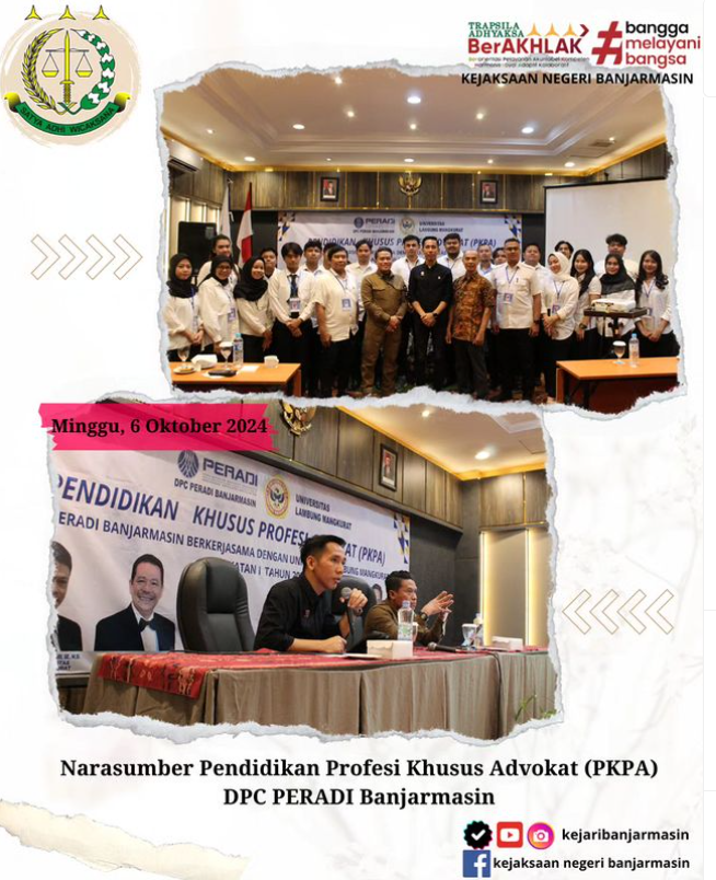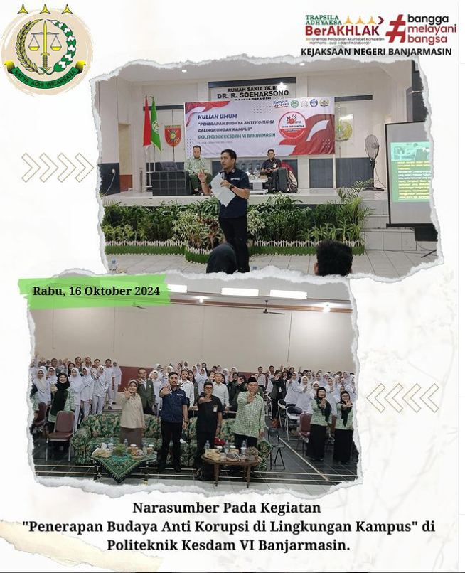 Rabu, 16 Oktober 2024, Kepala Kejaksaan Negeri Banjarmasin yang diwakili Kepala Sub Seksi Ekonomi, Keuangan, dan PPS Sendra Fernando S, SH., Menghadiri KULIAH UMUM “Penerapan Budaya Anti Korupsi di Lingkungan Kampus”. Bertempat di Aula Politeknik Kesdam VI Banjarmasin.