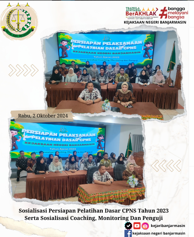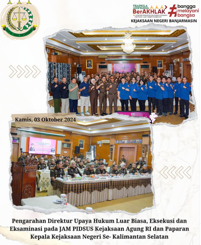 Kamis, 03 Oktober 2024 Kepala Kejaksaan Negeri Banjarmasin Dr. Indah Laila beserta Jajaran Melaksanakan kegiatan Pengarahan dari Direktur Upaya Hukum Luar Biasa, Eksekusi dan Eksaminasi pada Jaksa Agung Muda Tindak Pidana Khusus Kejaksaan Agung Oleh Bapak J. Devy Sudarso, S.H., C.N. dan Paparan Kepala Kejaksaan Negeri Se-Kalimantan Selatan yang bertempat di Ruang Aula Anjung Papadaan Kejaksaan Tinggi Kalimantan Selatan