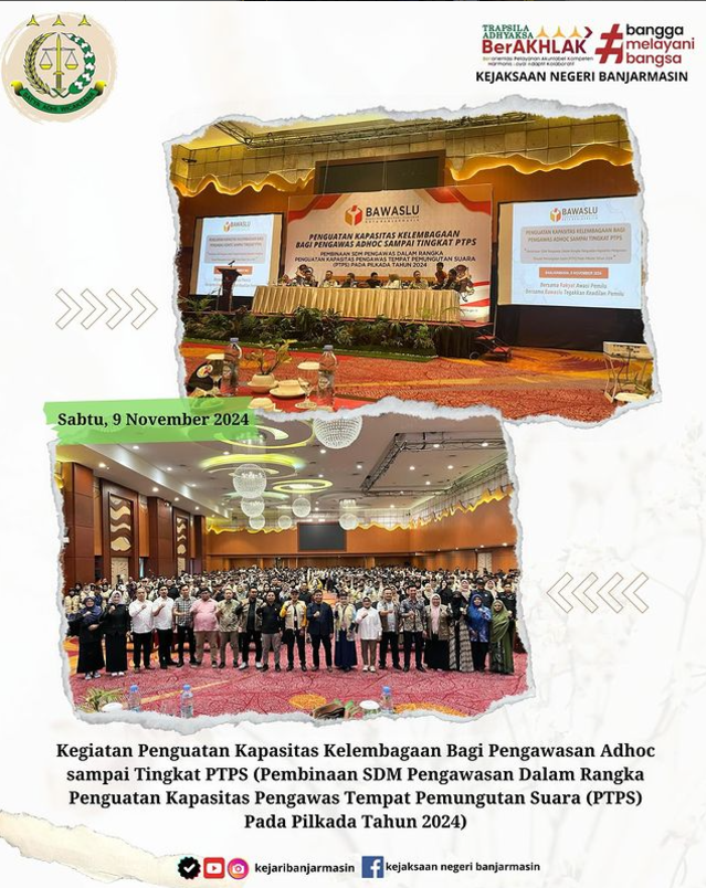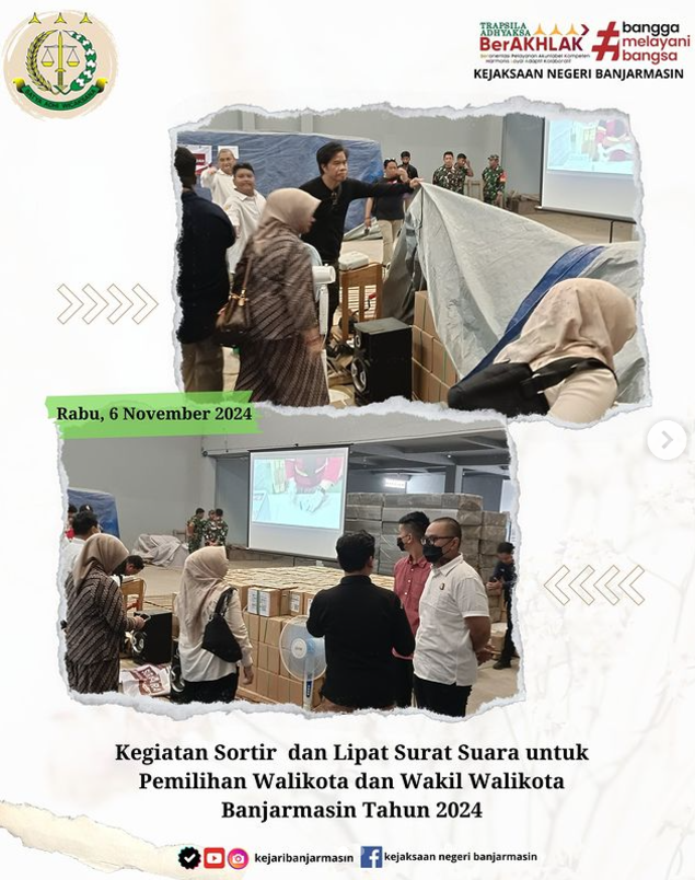 Rabu, 6 November 2024 Kepala Seksi Intelijen Kejaksaan Negeri Banjarmasin imas Purnama Putra, S.H.,M.H. yang dengan ini diwakilkan oleh Pemeriksa Forensik Digital pada Bidang Intelijen Muhammad Sabda Isa Almudlofar, S.Kom dan Hanindya Seno Saskara, S.H. Menghadiri Kegiatan Sortir dan Lipat Surat Suara untuk Pemilihan Walikota dan Wakil Walikota Banjarmasin Tahun 2024 bertempat di Gudang Logistik KPU Kota Banjarmasin, Jl RK Ilir Pekauman, Banjarmasin Selatan.