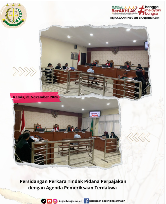 Kamis, 21 November 2024 Telah Melaksanakan Persidangan Perkara Tindak Pidana Perpajakan dengan agenda Pemeriksaan Terdakwa dengan Jaksa Penuntut Umum ANDRI, S.H., M.H., TITIEK MUSTIKAWATI, S.H., Dan RICKY SAR MARULI TUA PURBA, S.H., bertempat Ruang Garuda Pengadilan Negeri Banjarmasin.