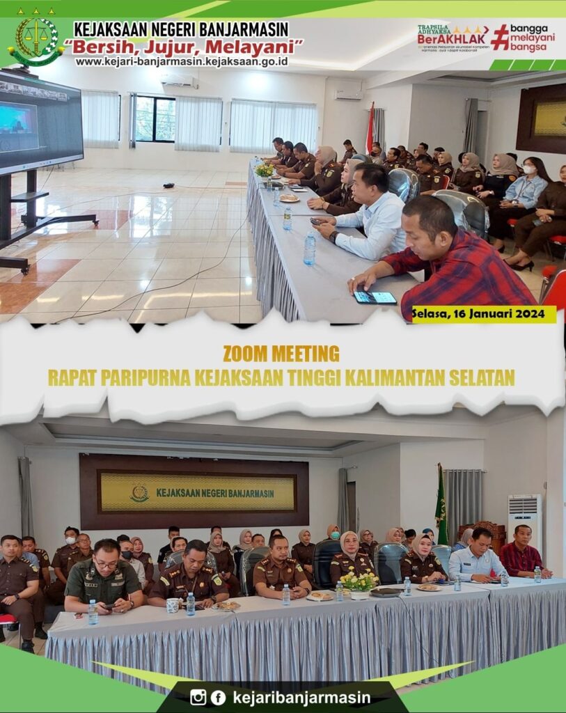 KEPALA KEJAKSAAN PEMBINAAN Zoom Meeting Rapat Paripurna Kejaksaan Tinggi Kalimantan Selatan Jan 23, 2024 admin 0 Comment Selasa 16 Januari 2024Kepala Kejaksaan Banjarmasin beserta jajaran mengikuti kegiatan zoom meeting Rapat Paripurna Kejaksaan Tinggi Kalimantan Selatan.
