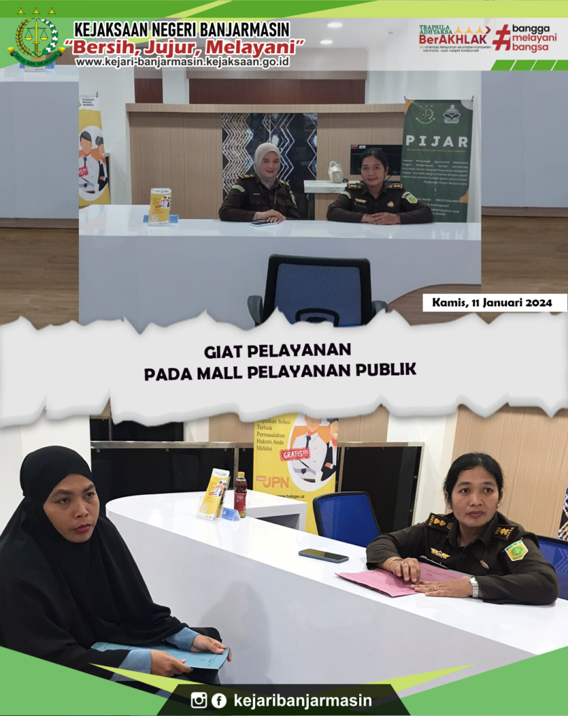PIDUM Giat Piket Mall Pelayanan Publik Kota Banjarmasin Jan 23, 2024 admin 0 Comment Kamis, 11 Januari 2024.Giat Piket Pelayanan Kejaksaan Negeri Banjarmasin Pada Mall Pelayanan Publik Kota Banjarmasin.