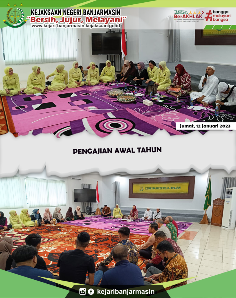 KEPALA KEJAKSAAN PEMBINAAN Kegiatan Pengajian Awal Tahun Jan 23, 2024 admin 0 Comment Jumat, 12 Januari 2024.Kepala Kejaksaan Negeri Banjarmasin Dr. Indah Laila Beserta Seluruh Pegawai Kejaksaan Negeri Banjarmasin Mengikuti Kegiatan Pengajian Awal Tahun Bertempat Di Aula Kantor.