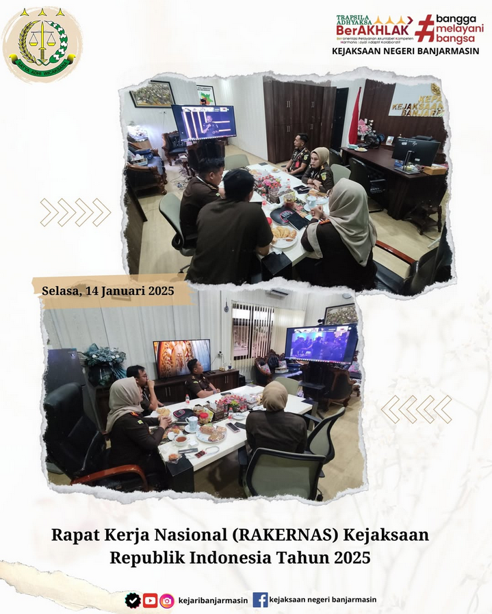 Rabu, 15 Januari 2025 Kepala Kejaksaan Negeri Banjarmasin Dr. Indah Laila Beserta Kepala Seksi, Kasubsi pada Kejaksaan Negeri Banjarmasin Pelaksaan Hari Ketiga Rapat Kerja Nasional (RAKERNAS) Kejaksaan Republik Indonesia Tahun 2025 secara daring lewat zoom meeting di Ruang Kerja Kepala Kejaksaan Negeri Banjarmasin