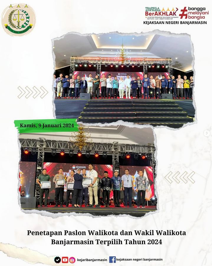 Kamis, 9 Januari 2025 Kepala Kejaksaan Negeri Banjarmasin yang dengan ini diwakilkan oleh Kepala Sub Seksi Ekonomi, Keuangan dan Pengamanan Pembangunan Startegis Sendra Fernando Saputra, SH Melaksanakan Rapat Pleno Terbuka Penetapan Pasangan Calon Walikota dan Wakil Walikota Terpilih Tahun 2024 Bertempat di Gedung Chandra Kota Banjarmasin