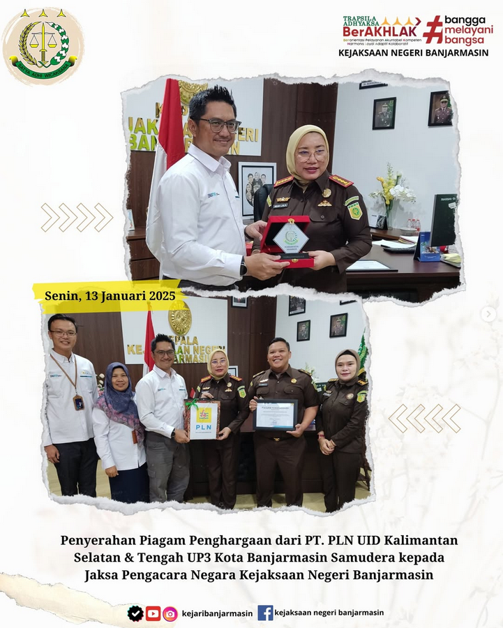 Senin tanggal 13 Januari 2025 bertempat di Ruang Kerja Kepala Kejaksaan Negeri Banjarmasin telah dilaksanakan penyerahan Piagam Penghargaan dari PT. PLN UID Kalimantan Selatan & Tengah UP3 Kota Banjarmasin Samudera kepada Jaksa Pengacara Negara Kejaksaan Negeri Banjarmasin atas Bantuan Hukum Non Litigasi Penagihan Penertiban Pemakaian Tenaga Listrik (P2TL) & Penertiban Pemakaian Subsidi Listrik (P2SL) Di Lingkungan PT. PLN (PERSERO) UP3 Banjarmasin Tahun 2024 dan penyerahan Plakat dari Jaksa Pengacara Negara kepada PT. PLN (PERSERO) UP3 Banjarmasin.