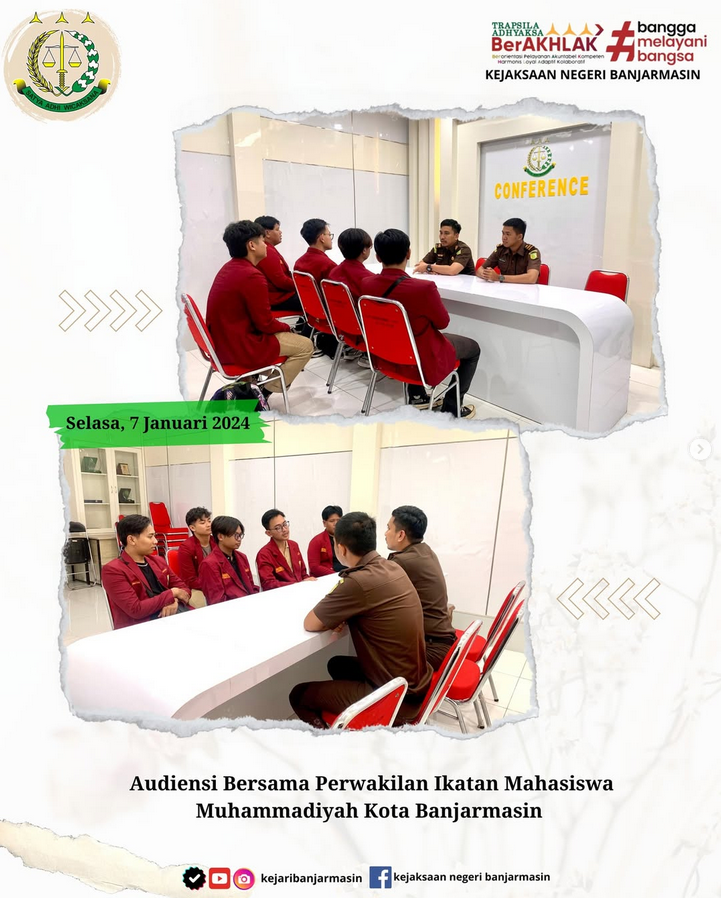 Selasa, 7 Januari 2025, Kepala Sub Seksi Ekonomi, Keuangan dan Pengamanan Pembangunan Strategis Sedra Fernando Saputra, SH. Melaksanakan Audiensi Bersama Perwakilan Ikatan Mahasiswa Muhammadiyah Kota Banjarmasin di Ruang Conference Kantor Kejaksaan Negeri Banjarmasin