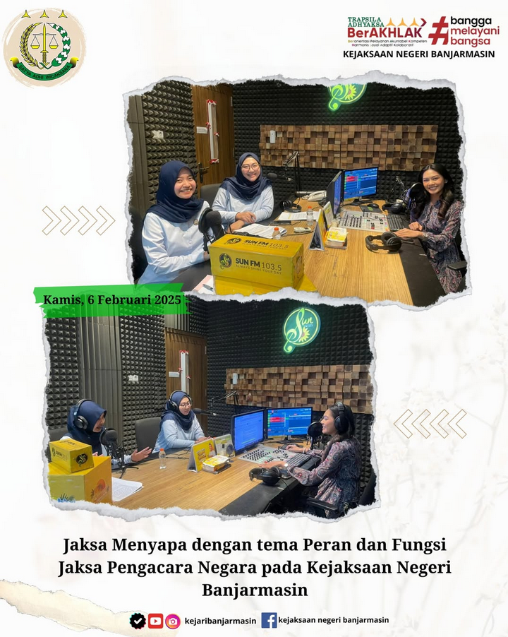 Melaksanakan kegiatan Jaksa Menyapa di Radio dengan tema Peran dan Fungsi Jaksa Pengacara Negara pada Kejaksaan Negeri Banjarmasin Bertempat Studio Sun FM 103.5 Duta Mall