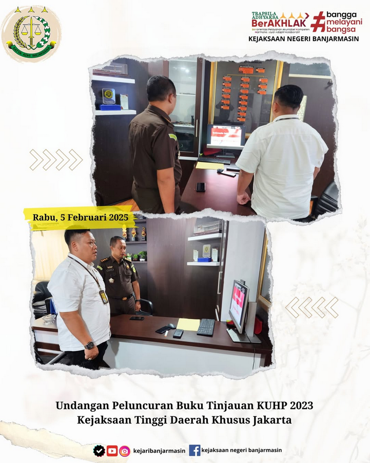 Rabu, 5 Februari 2025 Kepala Kejaksaan Negeri Banjarmasin beserta Jajaran yang dengan ini di Wakilkan oleh Kepala Sub Bagian Pembinaan ANDRI NANDA HEVEA NORFIKRI, S.H., M.H. dan Kepala Seksi Perdata dan Tata Usaha Negara Dr. AMIR GIRI MURYAWAN, S.H.,M.H Melaksanakan zoom meeting Perihal Undangan Peluncuran Buku Tinjauan KUHP 2023 Kejaksaan Tinggi Daerah Khusus Jakarta.