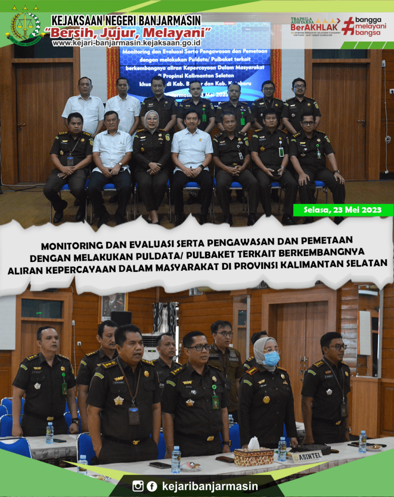 Selasa, 23 Mei 2023. Kepala Kejaksaan Negeri Banjarmasin Dr. Indah Laila Beserta Kepala Seksi Intelijen Dimas Purnama Putra, S.H.,M.H Menghadiri Giat Monitoring Dan Evaluasi Serta Pengawasan Dan Pemetaan Dengan Melakukan Puldata/ Pulbaket Terkait Berkembangnya Aliran Kepercayaan Dalam Masyarakat Di Provinsi Kalimantan Selatan.