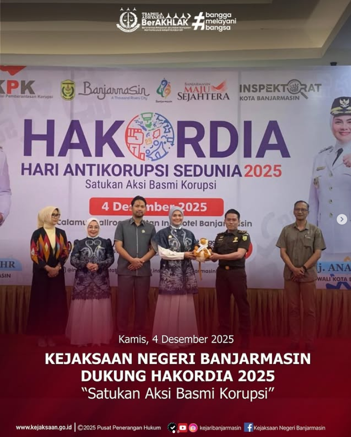Kepala Kejaksaan Negeri Banjarmasin yang diwakili oleh Jaksa Fungsional pada Seksi Tindak Pidana Khusus, Syamsul Arifin, S.H., menghadiri sekaligus menjadi narasumber dalam kegiatan Peringatan Hari Anti Korupsi Sedunia (HAKORDIA) 2025 yang diselenggarakan oleh Pemerintah Kota Banjarmasin pada hari Kamis, 04 Desember 2025.