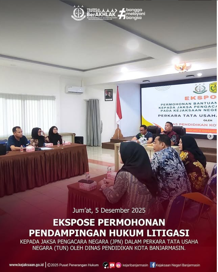 Jumat, 5 Desember 2025 bertempat di Aula R. Soeprapto Kantor Kejaksaan Negeri Banjarmasin telah dilaksanakan Ekspose Permohonan Pendampingan Hukum Litigasi Kepada Jaksa Pengacara Negara (JPN) Pada Kejaksaan Negeri Banjarmasin Perkara Tata Usaha Negara (TUN) Oleh Dinas Pendidikan Kota Banjarmasin.