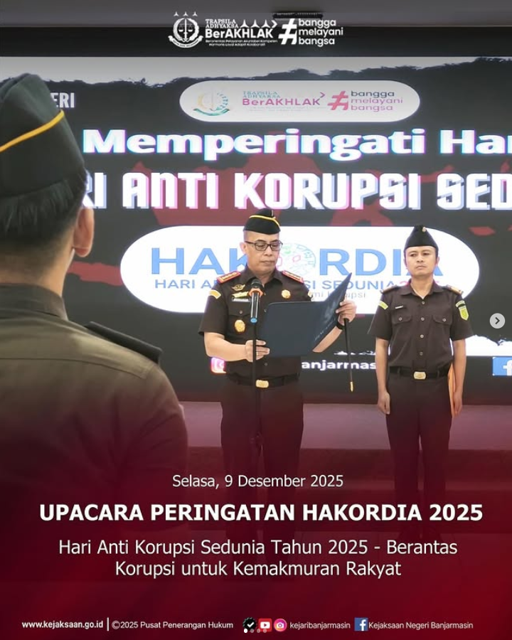 Upacara Peringatan Hari Anti Korupsi Sedunia (HAKORDIA) 2025 bertempat di Aula Soeprapto Kantor Kejaksaan Negeri Banjarmasin. Kegiatan dipimpin langsung oleh Kepala Kejaksaan Negeri Banjarmasin, serta diikuti oleh seluruh pegawai sebagai wujud nyata komitmen dalam memperkuat integritas, meningkatkan budaya anti korupsi, dan mendukung upaya pemberantasan korupsi di seluruh lini pelayanan publik.