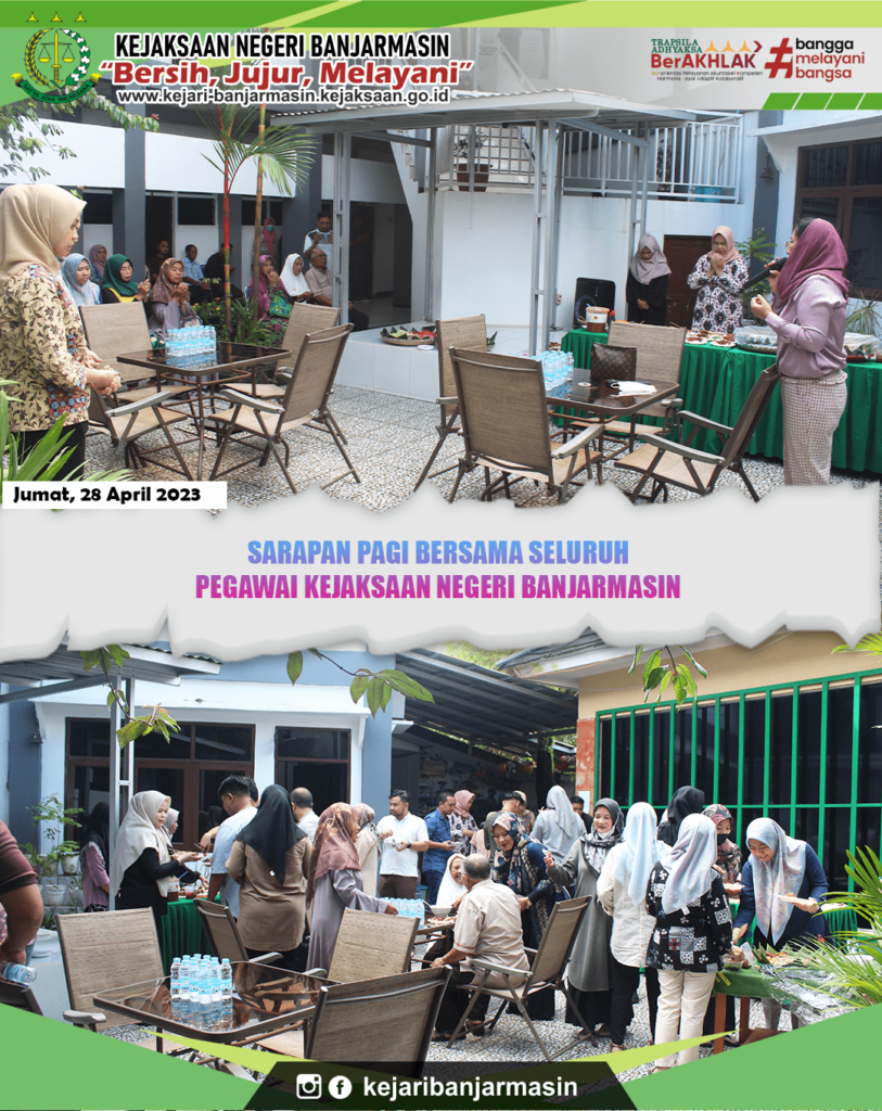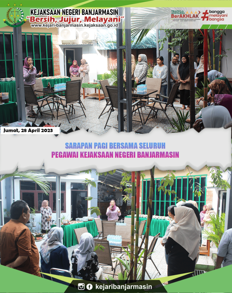 PEMBINAAN Sarapan Pagi Bersama by admin Apr 28, 2023 0 Comment Jumat, 28 April 2023. Sarapan Pagi Bersama Seluruh Pegawai Kejaksaan Negeri Banjarmasin.