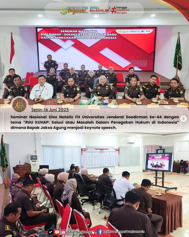 Senin, 16 Juni 2025, Kepala Kejaksaan Negeri Banjarmasin, Dr. Indah Laila, bersama Kepala Seksi Tindak Pidana Umum, Kepala Seksi Tindak Pidana Khusus, dan Jaksa Fungsional pada Kejaksaan Negeri Banjarmasin, mengikuti Seminar Nasional dengan tema “RUU KUHAP: Solusi atau Masalah dalam Penegakan Hukum di Indonesia”. Kegiatan ini dilaksanakan secara daring melalui Zoom Meeting dalam rangka memperingati Dies Natalis Fakultas Hukum Universitas Jenderal Soedirman ke-44.