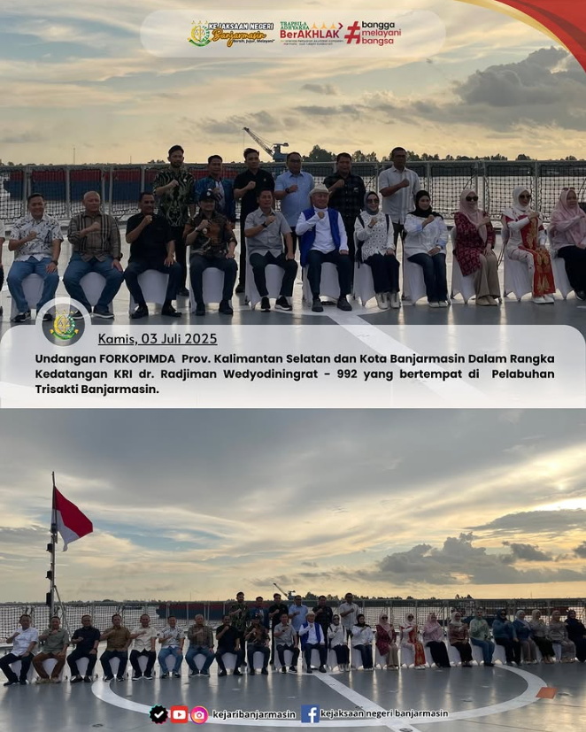 kamis, 3 Juli 2025 sekitar pukul 16:30Wita Kepala Kejaksaan Negeri Banjarmasin dengan ini diwakilkan oleh Kepala Sub Seksi Pra Penuntutan Masden Kahfi, S.H. telah menghadiri acara Sunset Coffe Break dengan FORKOPIMDA Prov. Kalimantan Selatan dan Kota Banjarmasin Dalam Rangka Kedatangan KRI dr. Radjiman Wedyodiningrat – 992 yang bertempat di Pelabuhan Trisakti Banjarmasin.